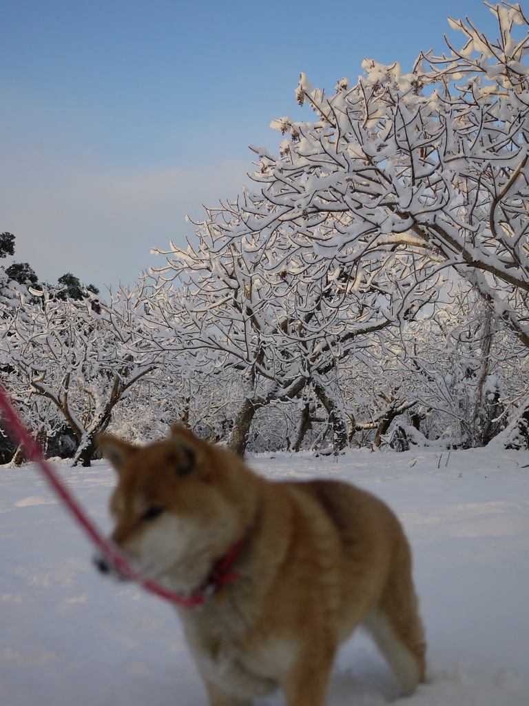 実はこの写真、おととしの大晦日に何十年ぶりに九州に大雪が降った時のものです。朝起きたら雪が積もっていたので、大喜びで家を飛び出して犬と遊びに行きました。収穫の終わったハゼの樹にきれいに雪が積もっています。