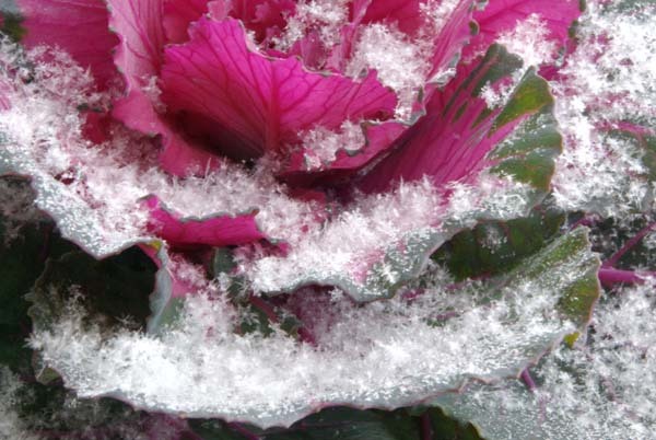ふわふわの羽根のような雪ですね!葉牡丹、鮮やかですね。