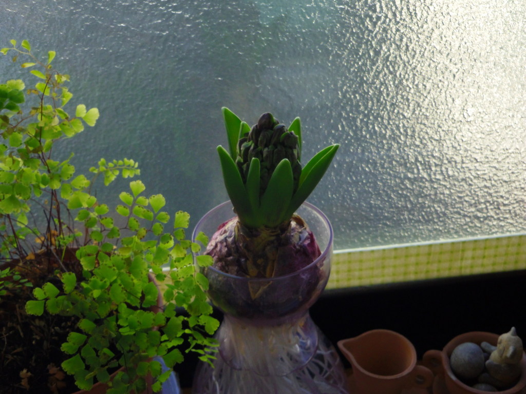 地植えのヒヤシンスは雪の下でまだ眠っています。 こちらの青紫はもうすぐ咲きそうですね^^ きっとあたりに甘い香りが漂うのね。