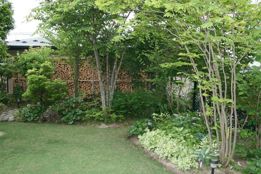 はじめまして~^^ いろんなグリーンがあって気持ちよいお庭ですね♪ 後ろの薪がすごいですっ!