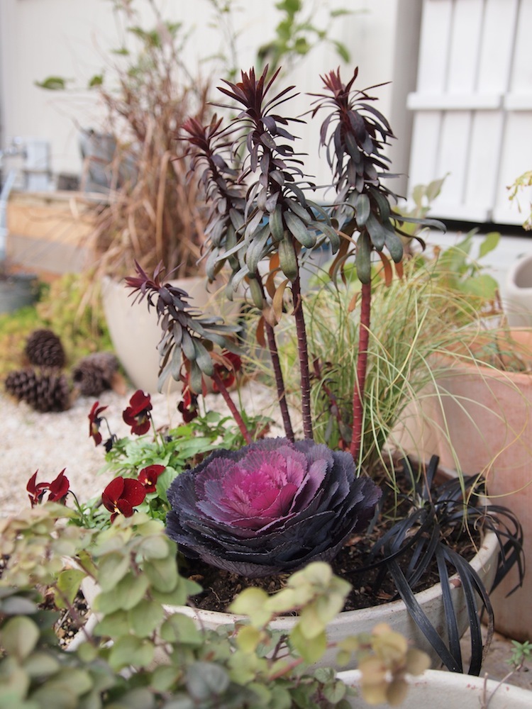 ちょっと渋めな色合いで寄せ植えしたのはユーフォルビア ブラックバード、葉牡丹 ブラックルシアン、カレックスなど。最近の葉牡丹はステキな品種が増えましたね♪