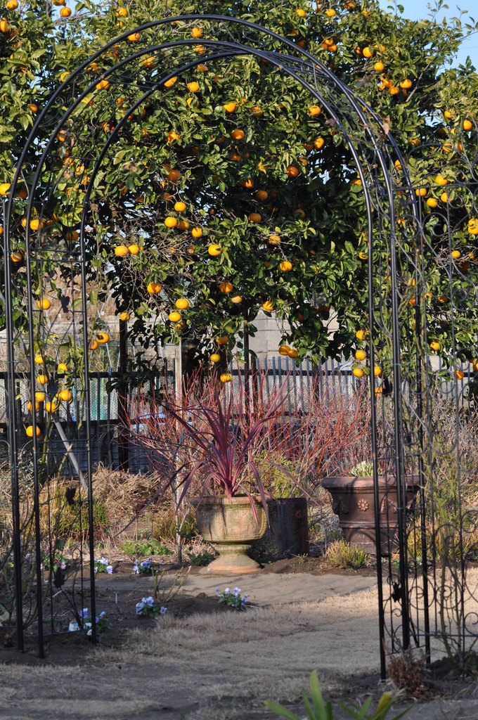 柑橘類がシンボルツリーとは、うらやましいです~♪見事なアーチになっていますね。こちらにはない風景で、驚きます~