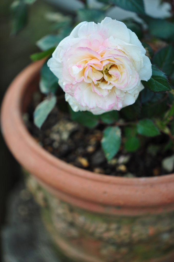 可愛いですね^^ 外で咲いてるミニバラですか?白にピンク色がのって、いい色ですね~(*^^*)