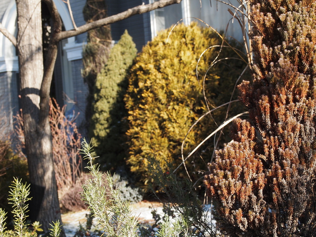 西日が差して…冬色に染まったコニファーたちが輝きます。