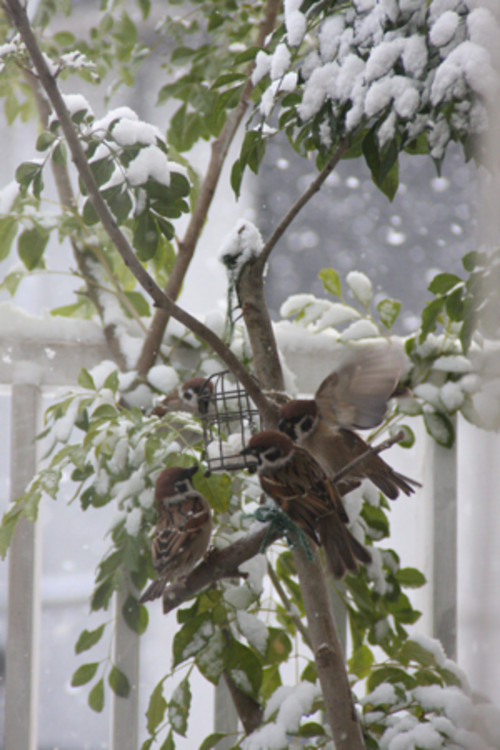 子供の頃に比べてスズメが減った気がします。雪の中でも活動的で元気ですね。