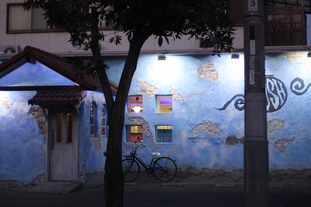 ポップな素敵な外壁・・思わず立ち止りたくなります。夕暮れの景色が魅力をましていますね(笑顔)