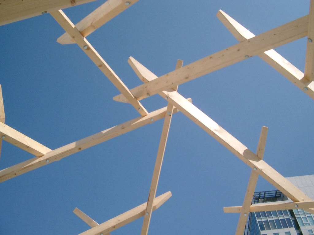 パーゴラ内部から空を見上げると、頂部は五角形の星型に組まれている。上空には黄昏時になれば金星が現われる。Venusは美の女神であり、金星を示しており、その象徴は古代より五芒星になっている。金星の動きが五芒星を描くことで、美意識を地球に送ってくれている。