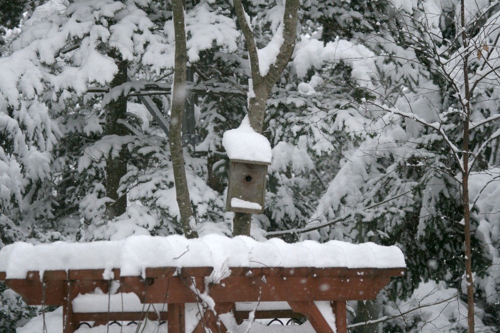 庭のモミジの期にかけてある巣箱も真っ白な綿帽子をかぶっていました。