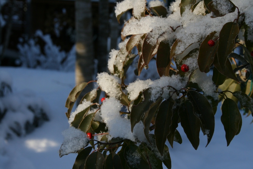 ソヨゴについた雪。本日(1月25日)の朝は、冷えていたため、パウダースノーがキラキラト輝いて、とてもきれいでした。