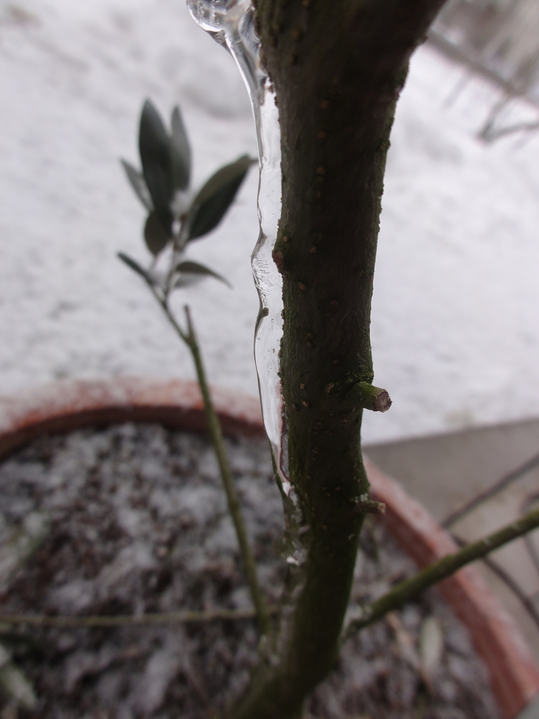 今朝は本当に寒くて、外を走る車もガリガリガリって凍った雪の上を通る音がしていました。オリーブの枝も氷がついていました。