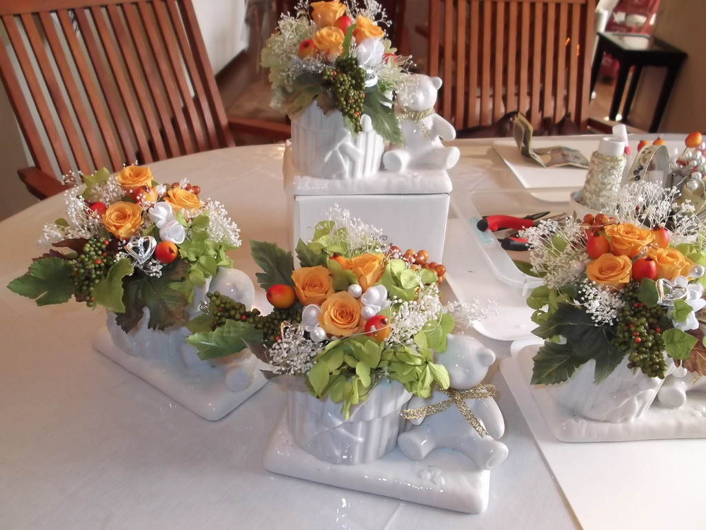 同じ花材でも、それぞれの出来上がりになってほんと、素敵です。楽しそうなお教室の様子が、見えるようですね(^^)