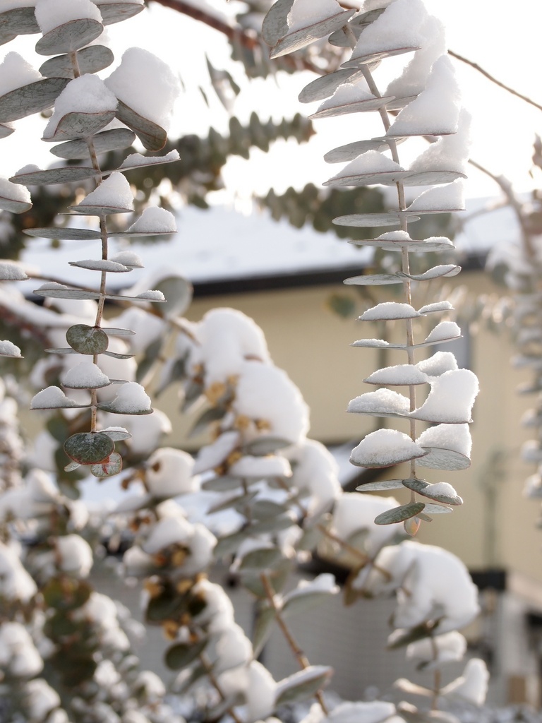 「銀丸葉ユーカリ」の葉っぱも、まっさらな粉雪を纏って…