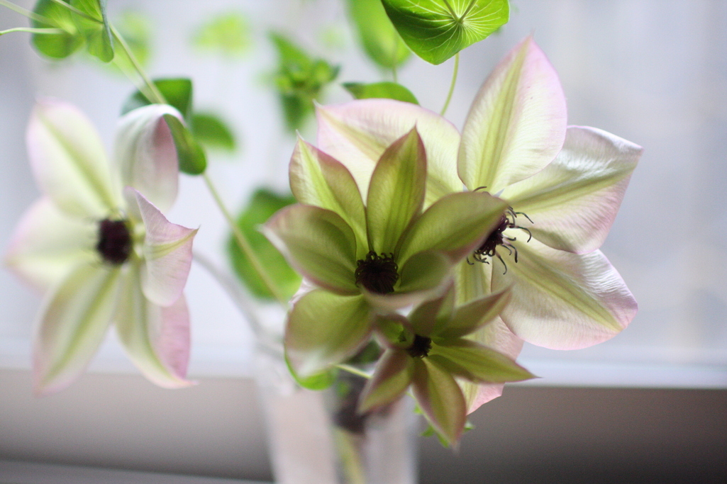 すごい、この寒空にまだ咲いていてくれてるんだ。うす緑がかかって綺麗なクレマチスです。