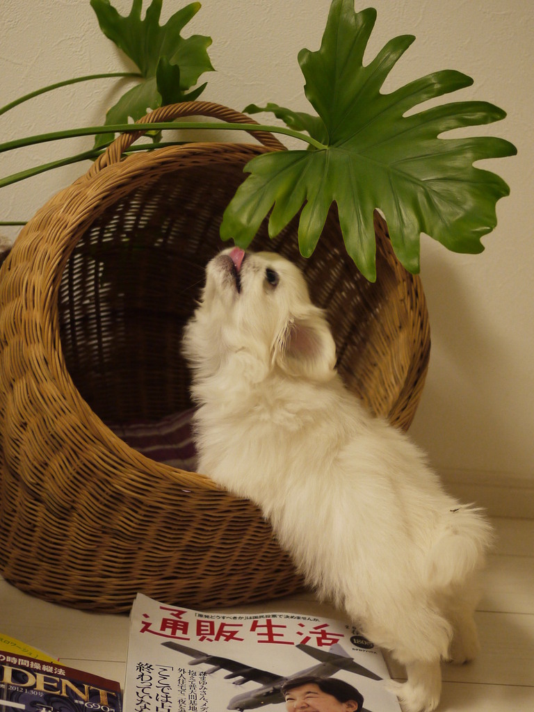 かわいい舌がペロッと出てますね♡観葉植物はわんちゃんにとって毒になるものもあるので目が離せませんね(^▽^;)