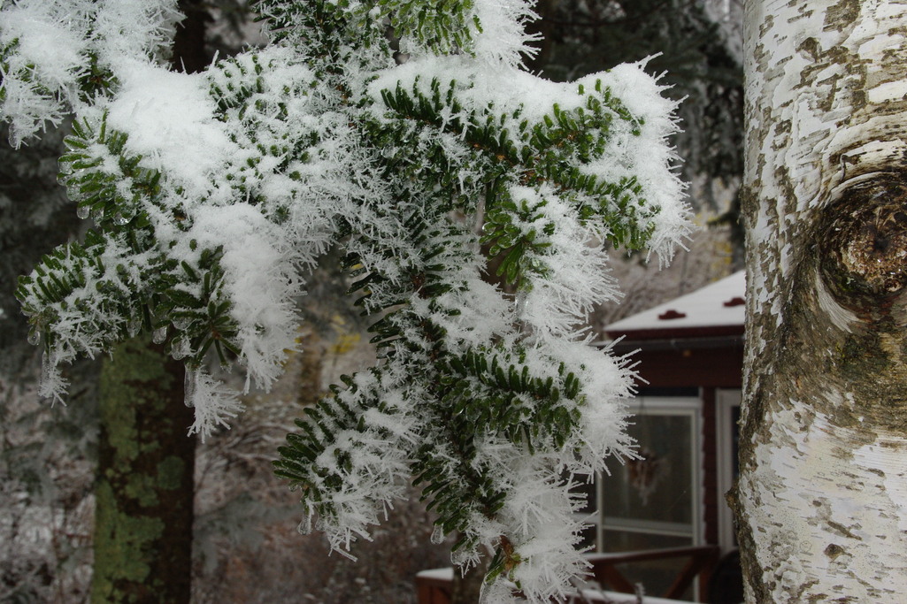 daさん。こんばんは。この時は零下8度位かもしれません。記憶あやふやですが、昼暖かく雨が降り夕方から急に寒くなり雨が木々に当たり氷着し、そこに雨から雪に変わって出来た景色です。NHKでは雨氷と10年ぶりとか放送していました。21年の2月(前に昨年と書きましたが、間違いでした。すいません)でした。翌日、朝は晴れ見事な結晶の花が