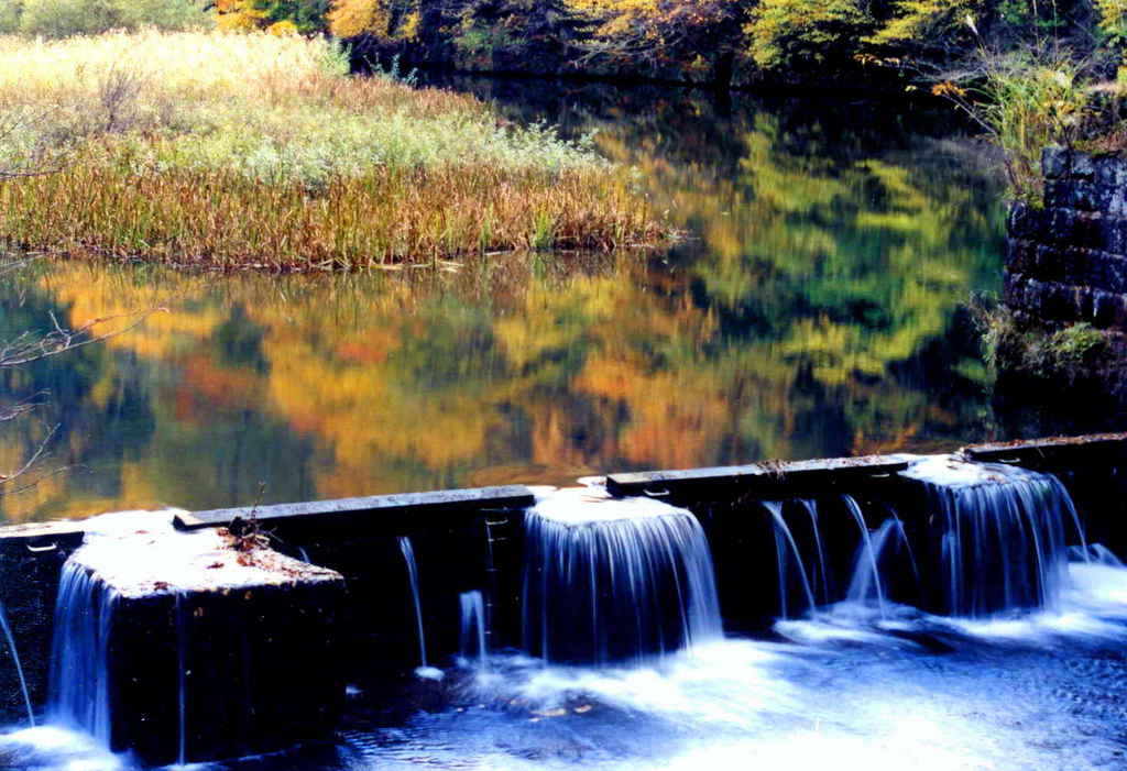 秋田市内の仁別国民の村というところに行く途中の溜め池です、時が止まったような紅葉の写りこみと時が動いている水の流れを時を止める写真で表現するって不思議ですね。