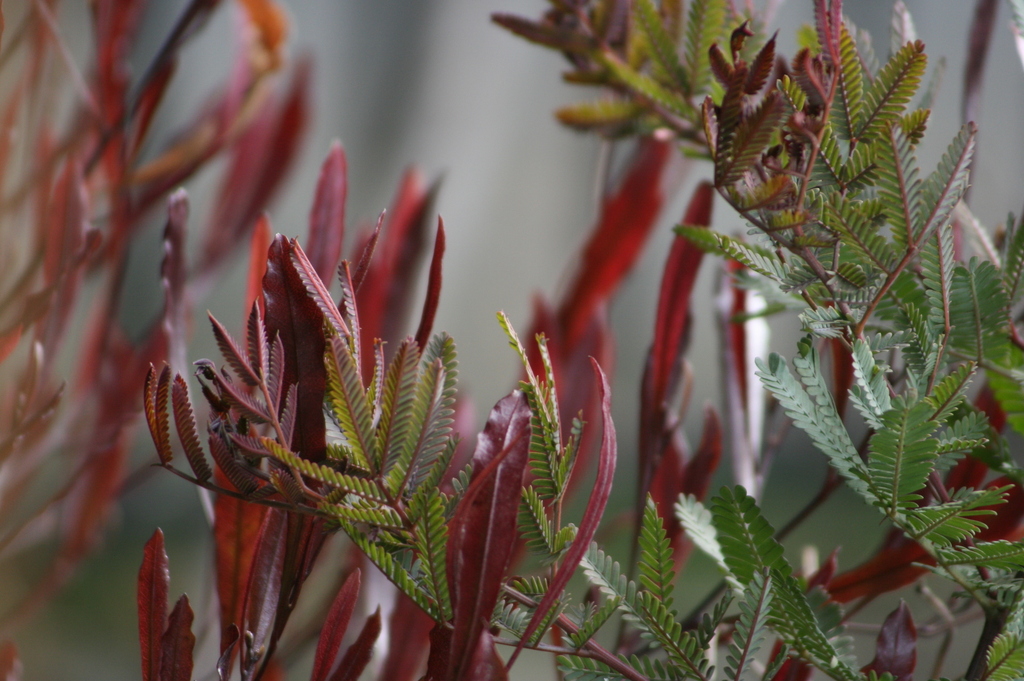 寒くなってドドナエア、ミモザプルプレアの新芽がいい色に・・