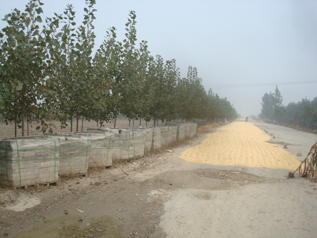 街路樹の緑と道路にコーンが干してある風景。。。家畜用?それとも・・・・