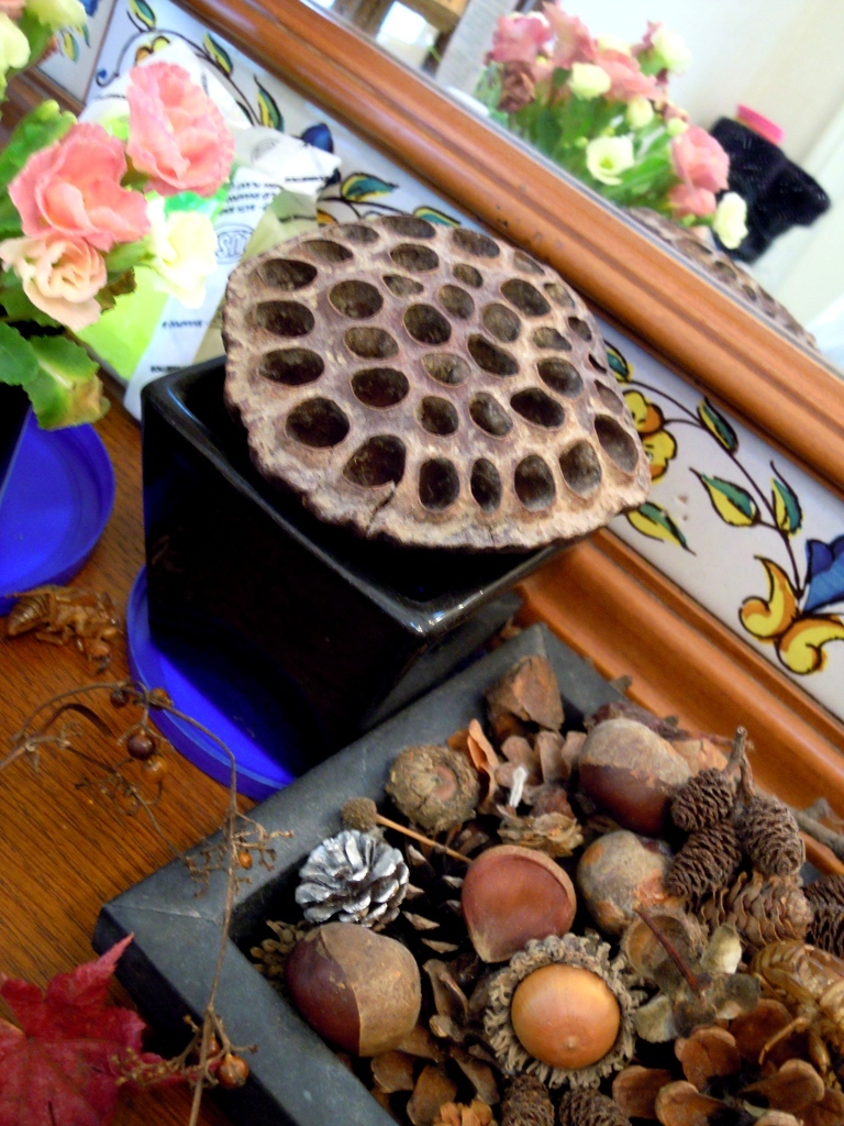 蓮の花柄、クヌギ、クリ、サザンカの実などなど。