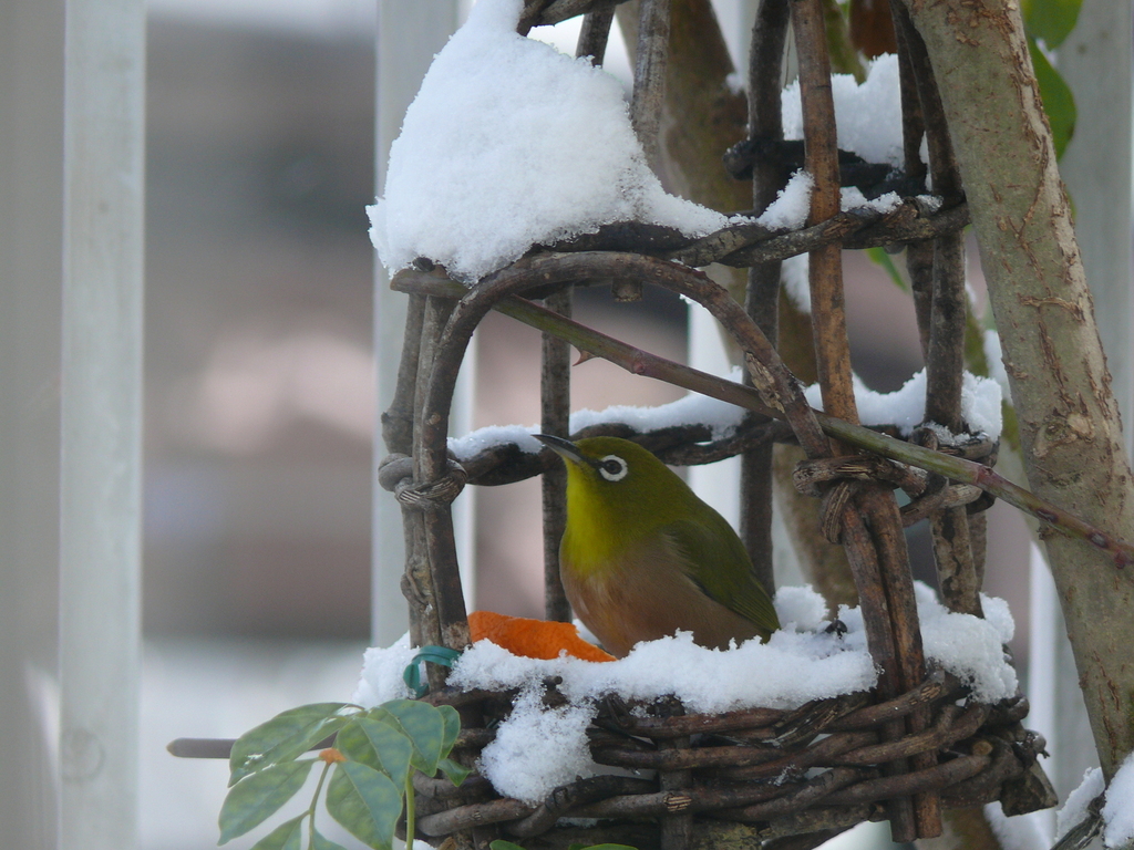 とっても可愛い篭ですね(^_-) 我が家では番のメジロをヒヨドリが追っ払って、そのヒヨドリを野良猫が狙って・・・(ー_ー)!! 毎日すごいドラマが繰り広げられています(@_@;)
