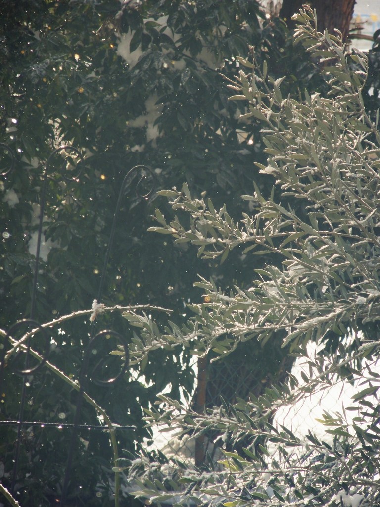 宝石のような霧が、オリーブの葉に落ちていきます。