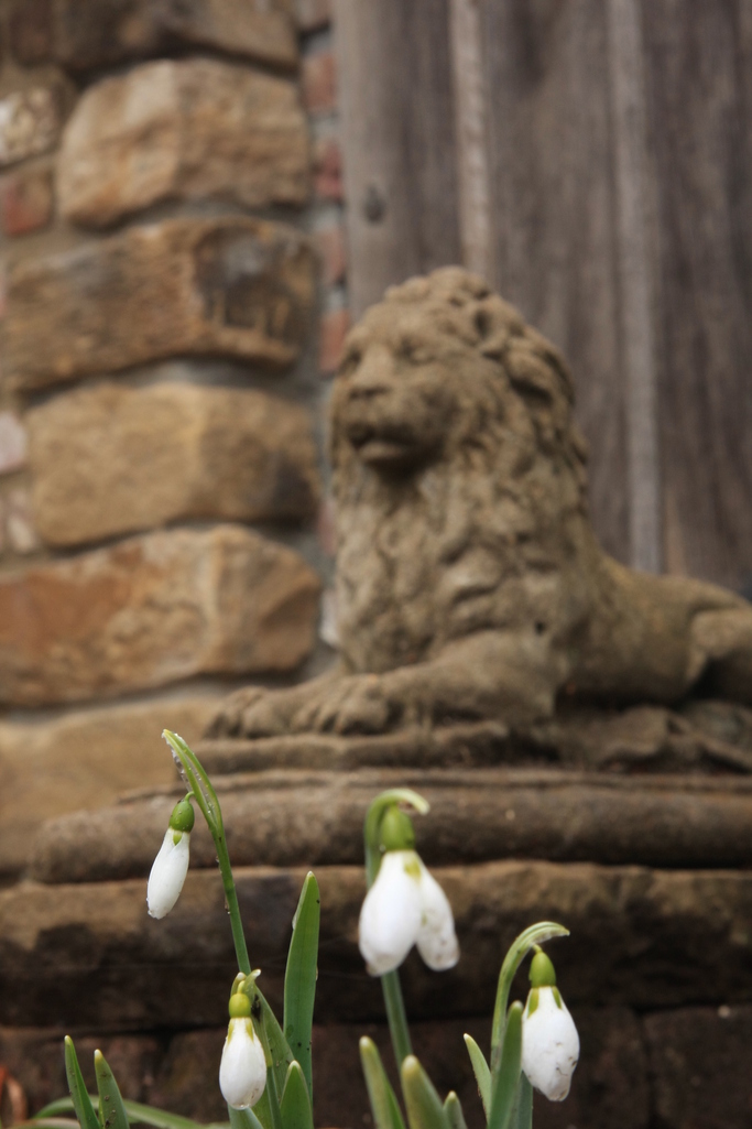 ライオンさんの所にも春が♡ 小さなスノードロップと堂々とした門番さんの対比が物語のようです^^