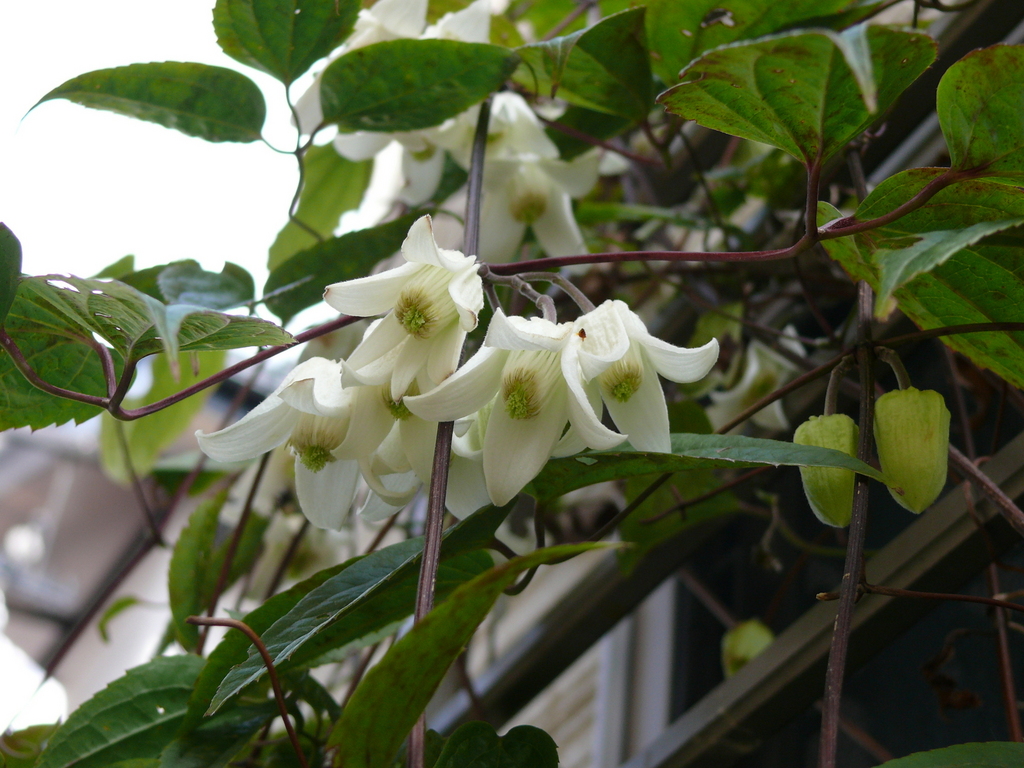常緑のクレマチスうららましいです。私の所は寒すぎて冬越しができません。浴室の窓に誘引とは良い考えですね。目隠しにもなり、花も楽しみ、種類によっては、香りも、良い考えですね。
