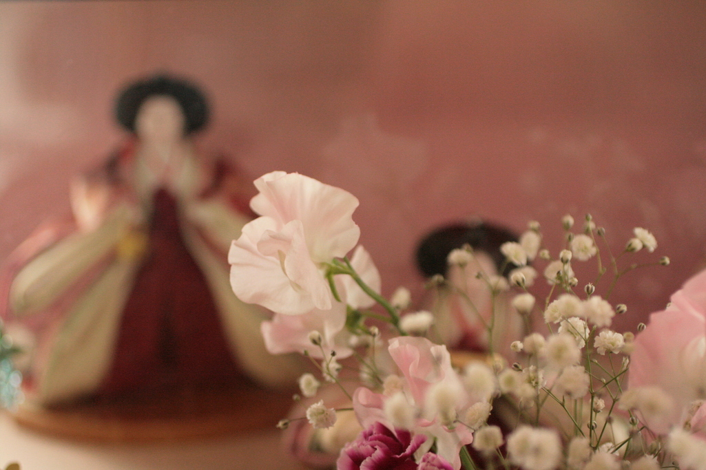 バックの色が、とっても好きです。桜色のスイトピー、かすみ草と、ぼんやり三人官女が、素敵〜。三人官女の着物、いい色ですね(^^)二番目さん、優しいお母さん、大好きでしょうね(^。^)うちの娘は、そろそろ彼におよめにもらってもらいたいですが…(^^;;