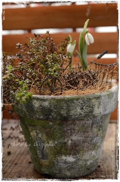 ペイントすると、鉢がこんなにアンティークな感じになるんですね。よくみると、なんか鉢に字もかいてあるし。庭友さんのてづくりワイヤー手押し車も上手だな.....