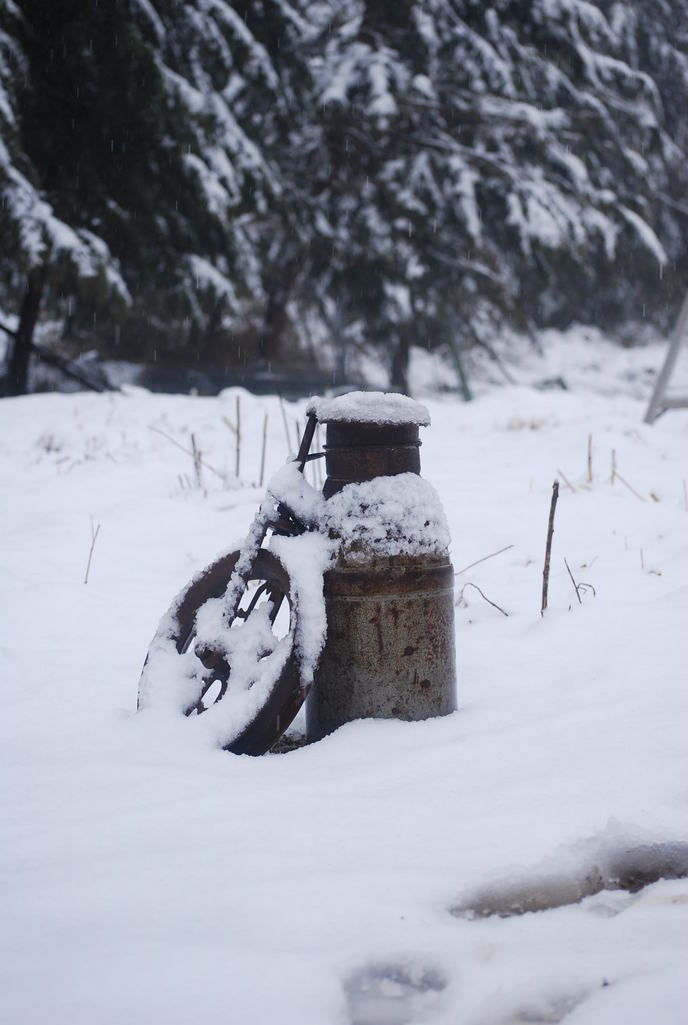 錆びたミルク缶と大きな滑車どちらももう何十年も前に使われなくなった物