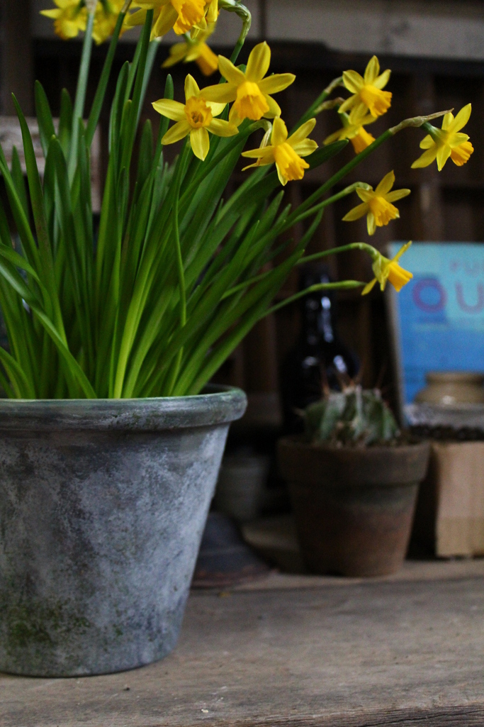一鉢一種。私の好きな植え方です。鉢の色と水仙の黄色がとてもよく合っていますね^^!