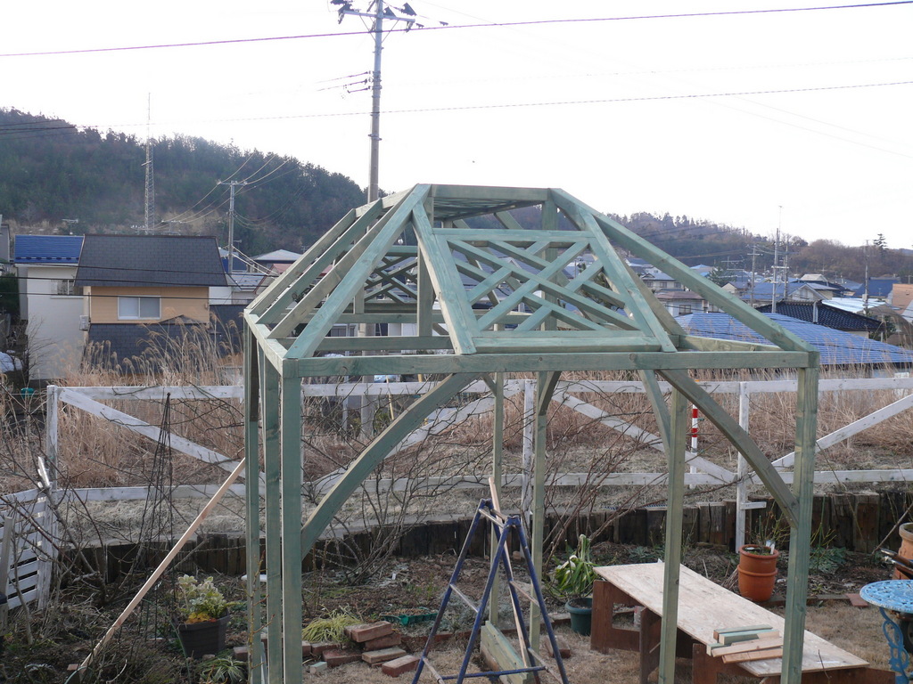 バラがからまり空を見上げた時どんな景色が広がるのでしょうか!想像しただけでワクワクします~素晴らしい新作ですね。スライドショウでイングリッシュローズに囲まれたバイク小屋までいきました~(笑顔)惚れ惚れ・・昨年のご家族皆さんでデザインされた可愛い窓の小屋など手作りの暖かさが伝わりますね♪