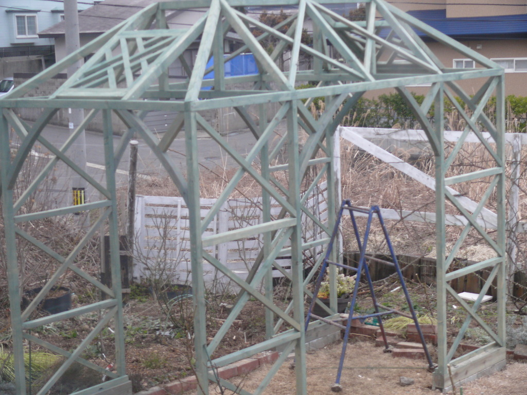 妻いわく、コンサバトリーみたいと言いました。バラを這わせると、せっかくの骨核が隠れてしまうので部分的に見せるか、半分ほどにしておしいというのが私の希望です。色も形も芸術、アートです言葉がでません。木組みの角度、設計大変だったと思います。近くなら見に行きたい。