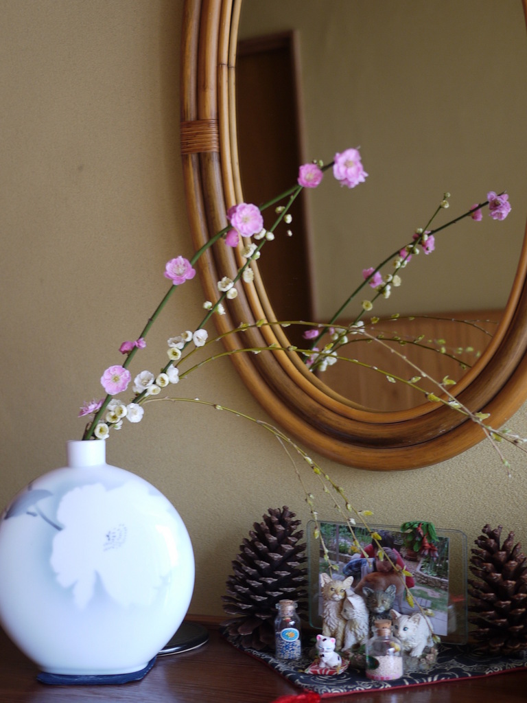 実家の玄関にも飾ってありました。白い梅は弟の小学校卒業記念樹だったかな?