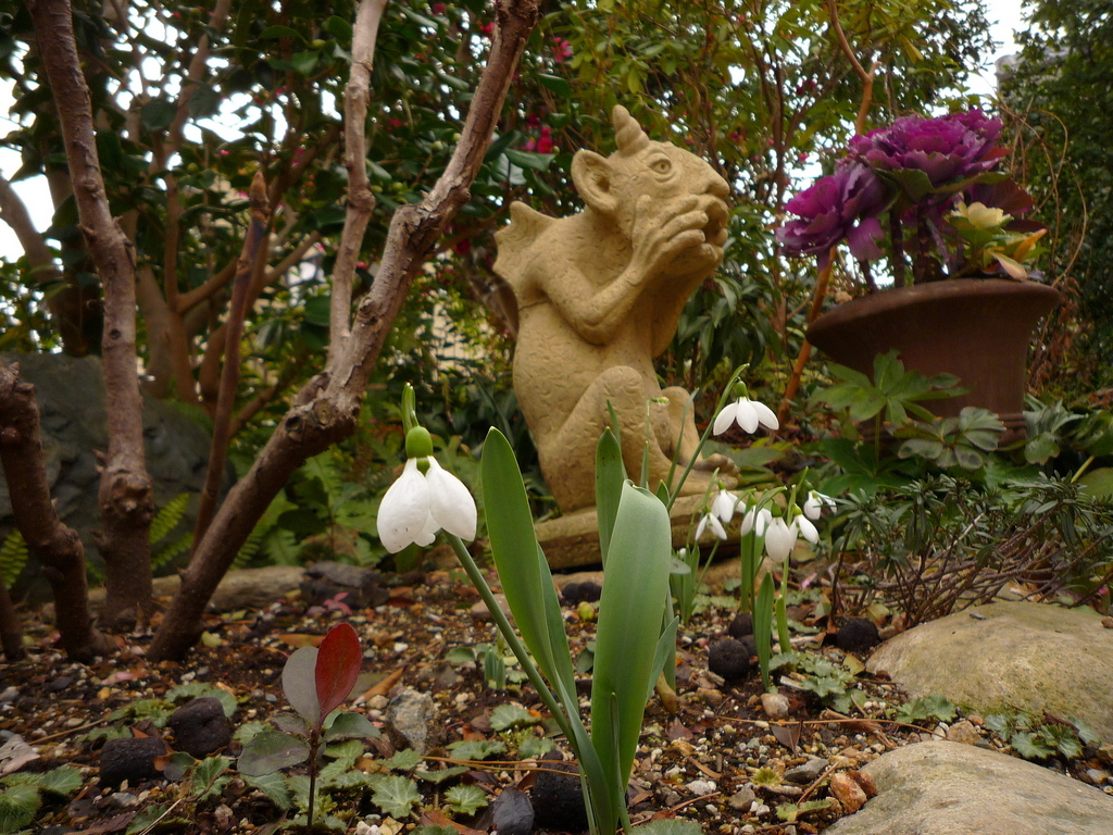 手前に咲くスノードロップと、ガーゴイル。ガーゴイルがおとぼけで可愛いですね^^