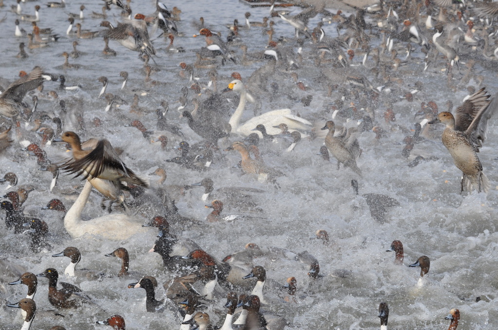 水しぶきと鳥の飛翔姿が躍動感と、地球の生命の息吹を感じさせる素晴らしい一枚ですね。