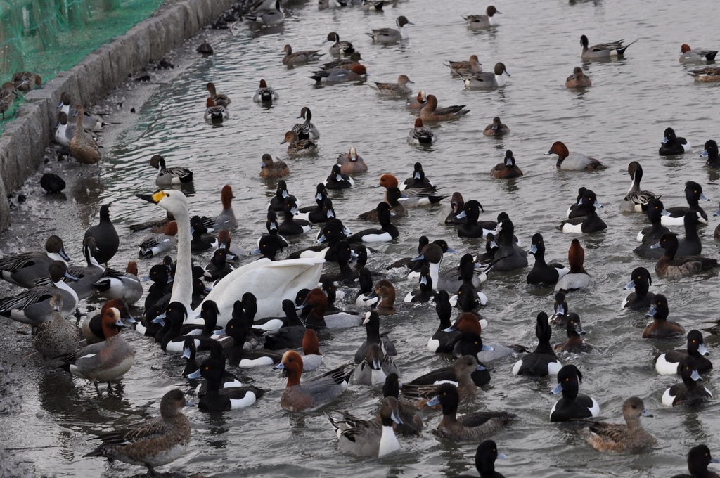 ところが、瞬く間に白鳥はカモ軍団に取り囲まれます。