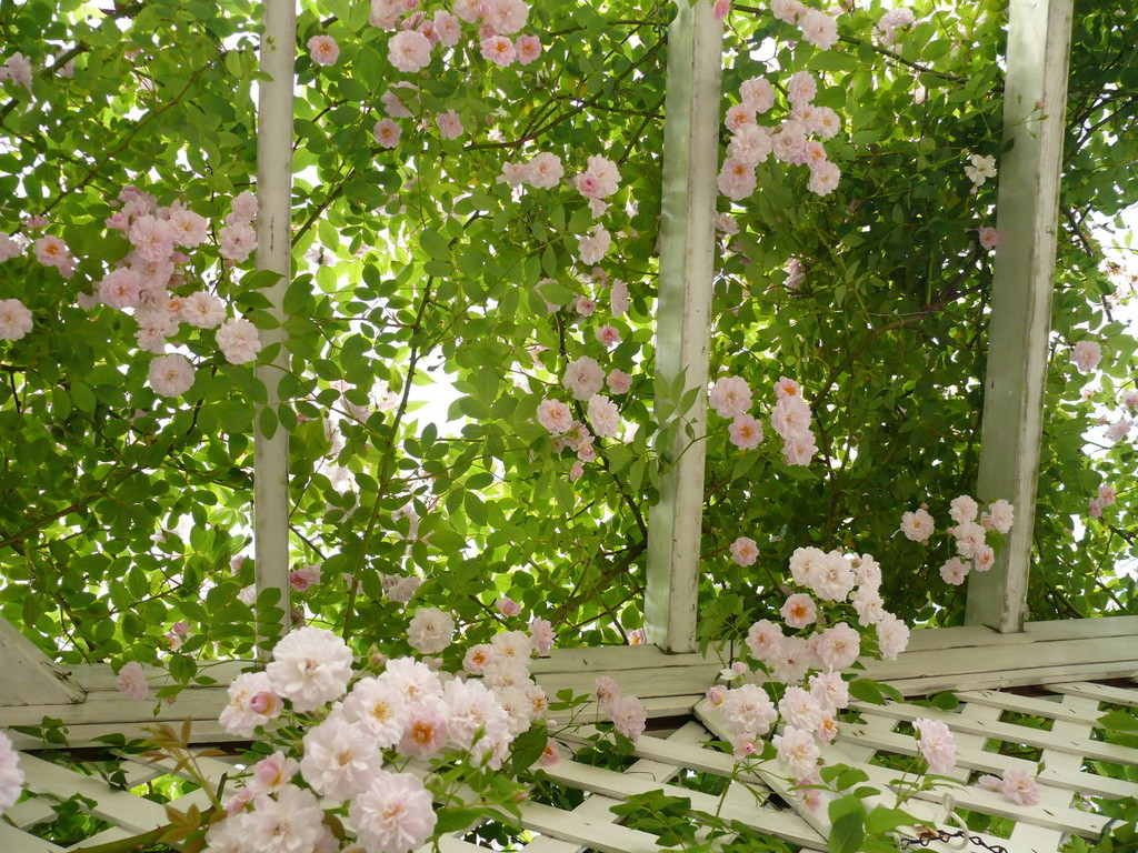 いい香りで、ほんとに幸せ~♪って感じですよね^^茂りすぎない葉っぱ、ちょーどいい多さのお花に、お日様が透けていいですね^^こんなところは、日が高くなってからだと、こんな写真が撮れるんですね。枝の線も誘引の参考になりますね^^