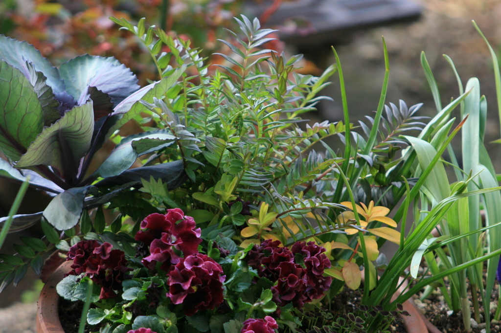 ポカポカ陽気でポレニウムやヒペリカム・・ぐんぐん伸びてきました。一月にアップした寄せ植えです。