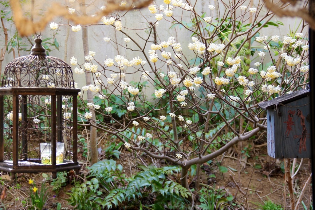 ミツマタと素敵な鳥かごのコラボ、良いですね!鳥かごがないのとあるのとでは全く違う風景になりそうですね。