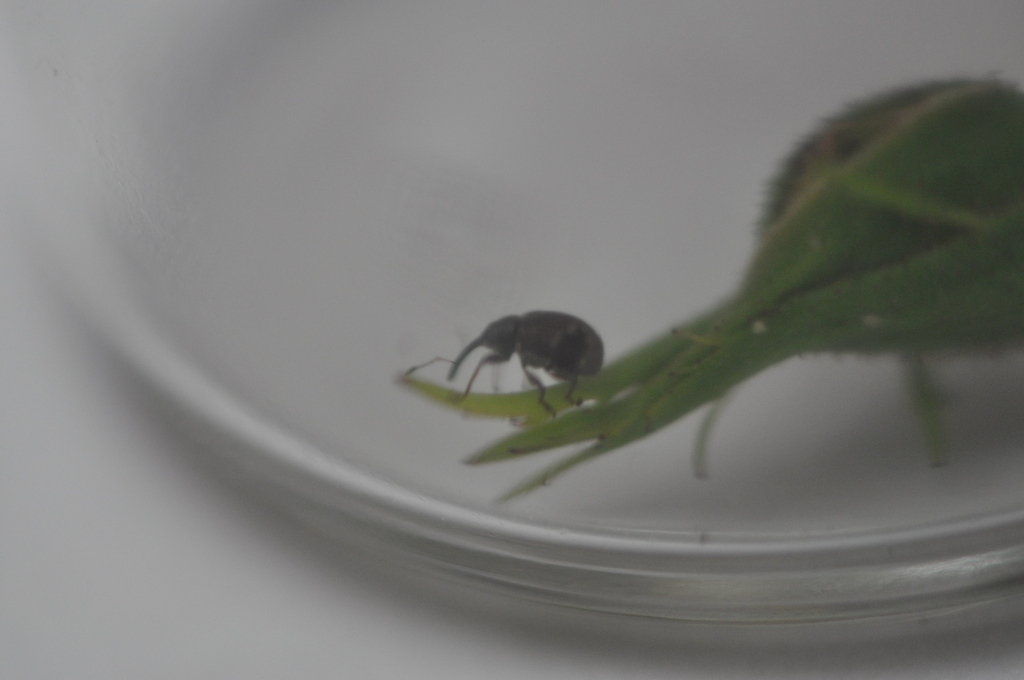 ビンの中に投獄し、薔薇の蕾を入れたら、よってたかって瞬く間に穴だらけにしてしまいました! 許せませんプンプン!!