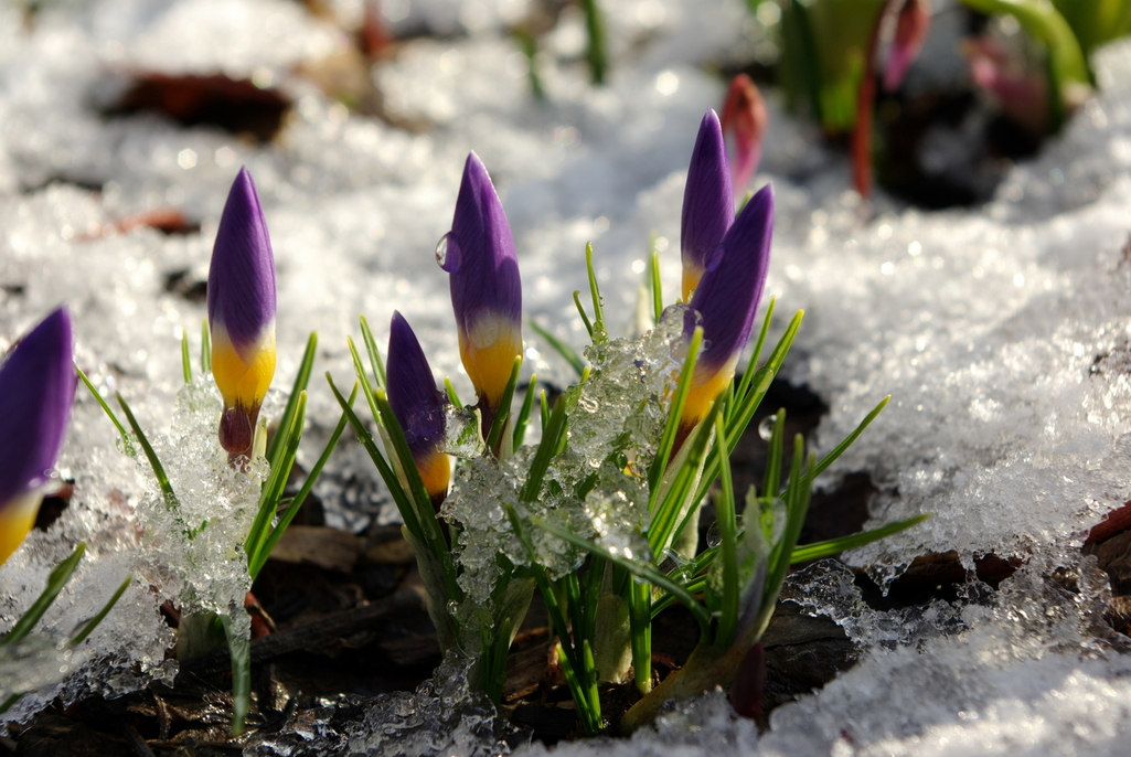 シャーベットのような雪ですね!冷たそうですが、こんなに立派な蕾が上がってきているんですね!!