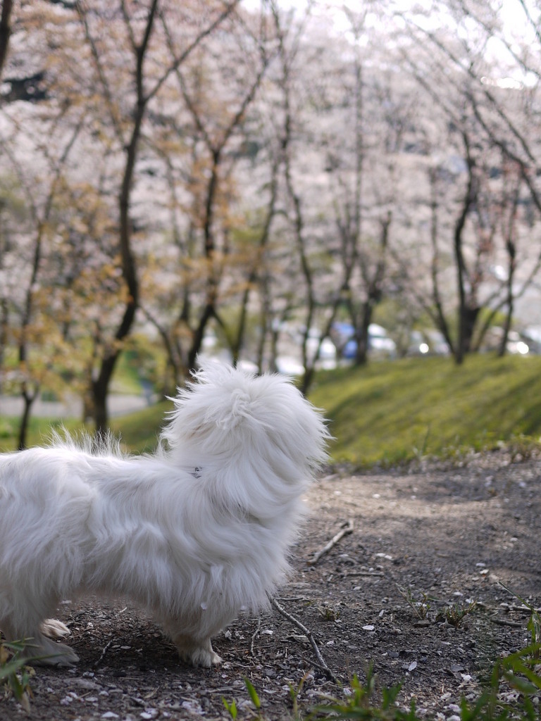 花見をご主人とできるとは幸せな愛犬。なにを振り返り考えるのか、哀愁があります。