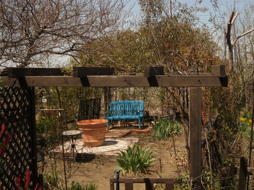このベンチは去年塗り替えたんですが、青色が濃すぎてイマイチなんです。