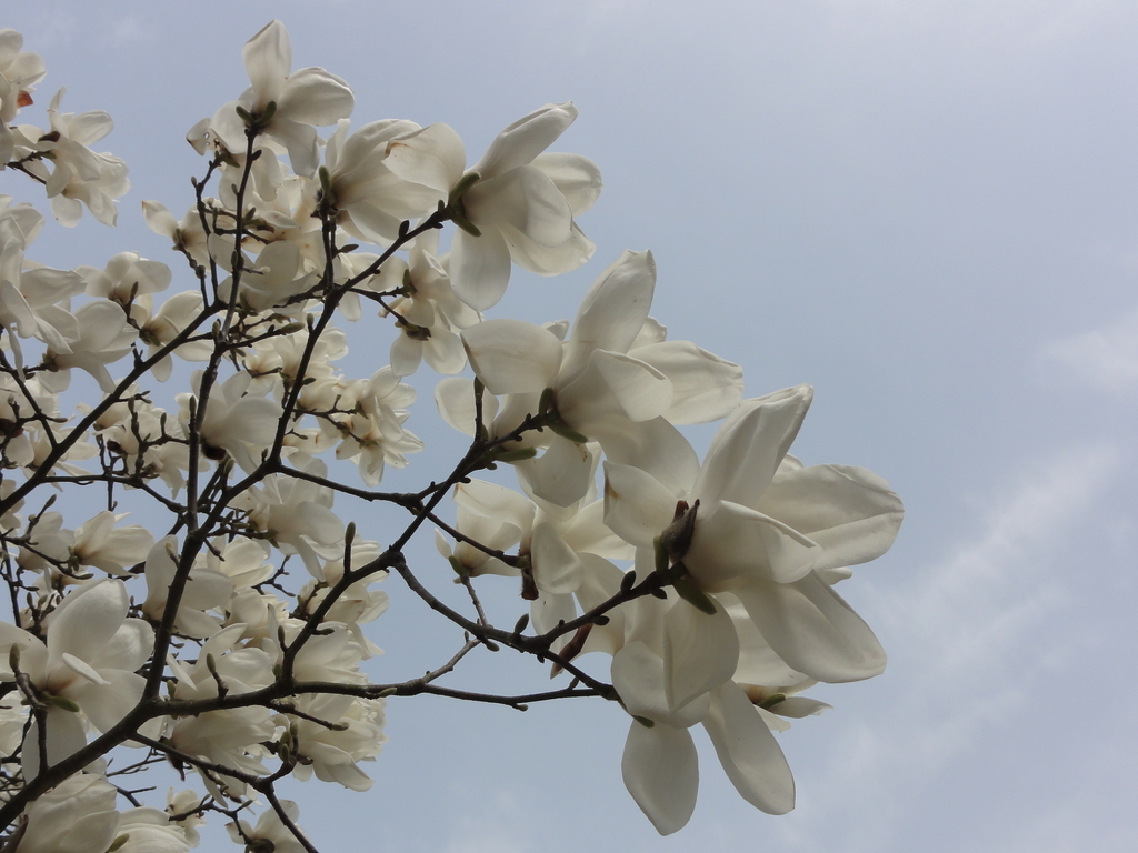 近くのお寺まで散歩しました。白いモクレンでしょうか?満開になっていました。