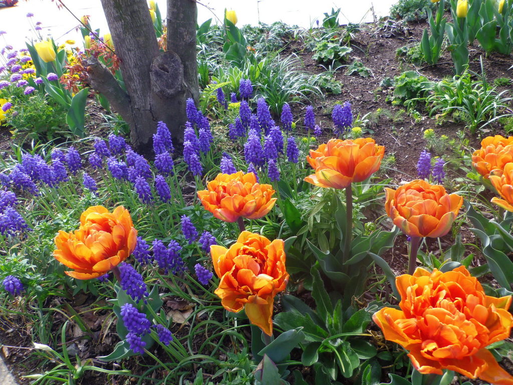 八重のチューリップとムスカリのコラボ、素敵ですね。 脳を刺激する色あわせ、最近は大好きです。 年取ったのかしら・・・(~_~;)