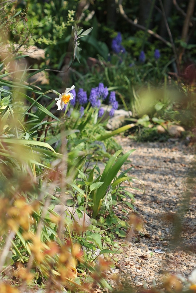 青いムスカリが、かたまって咲く姿が好きです。このスイセンは、山吹色がかった浅いラッパが、素敵です。