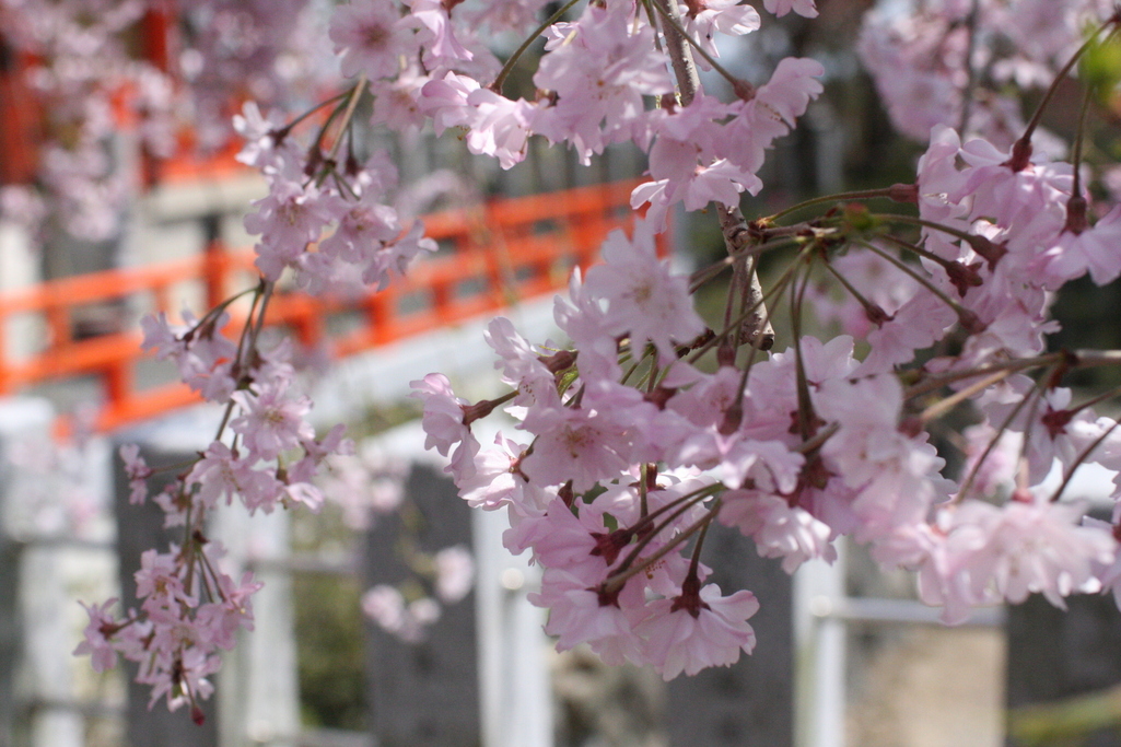 赤い桟橋に、しだれの桜がよく似合ってます。