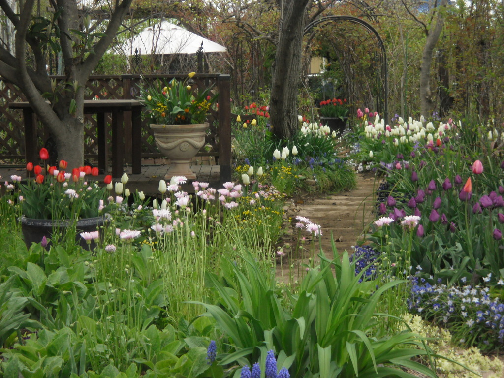 素晴らしいですね!チューリップをひきたてている下草や宿根草が流れをつくっているのでしょうか・・ナチュラルで素敵です。日々表情が変わるガーデン・至福のひと時ですね(笑顔)
