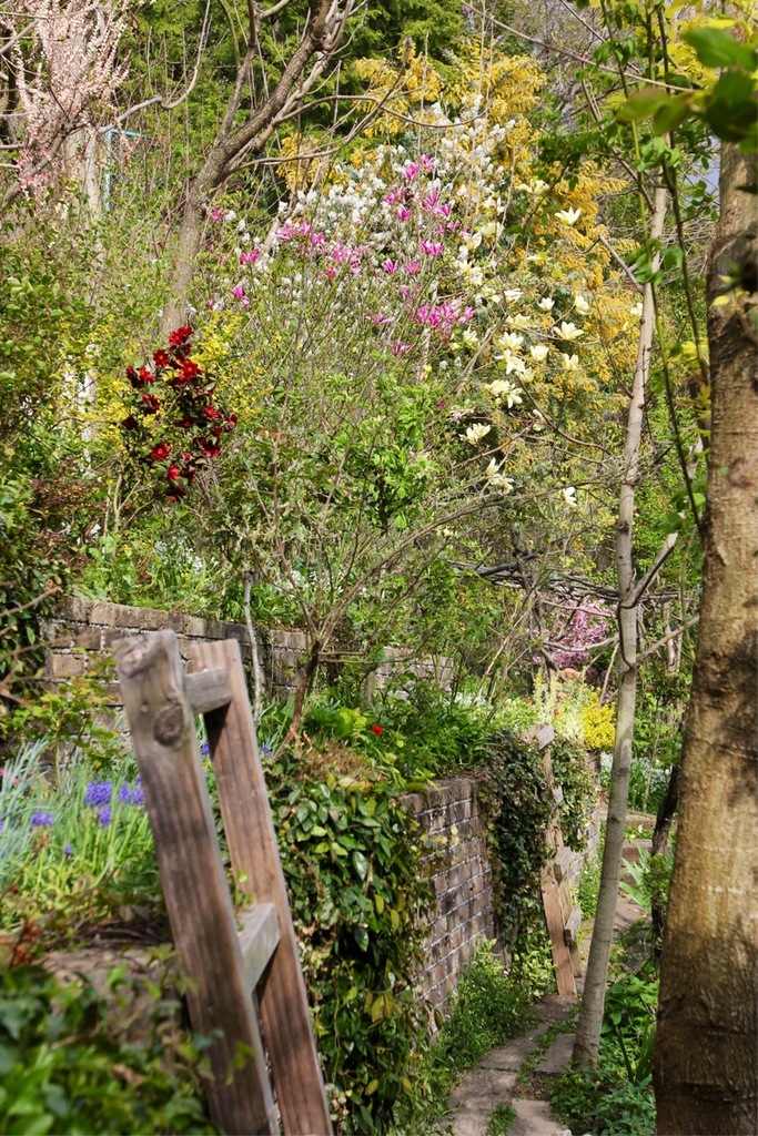 この梯子は…ガーデンのアクセントになっていますが、ちゃんと使ってるんですよ!この梯子に登って、一段目の花壇のガーデン作業をします。